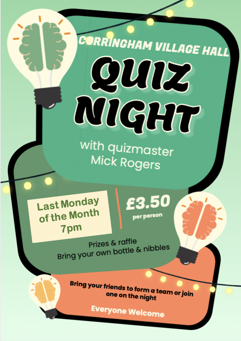 Think you’ve got what it takes to be the ultimate trivia champ? Join us at Corringham Village Hall for Quiz Night—fun, friendly competition, and plenty of laughs as you test your knowledge (or your guessing skills!).