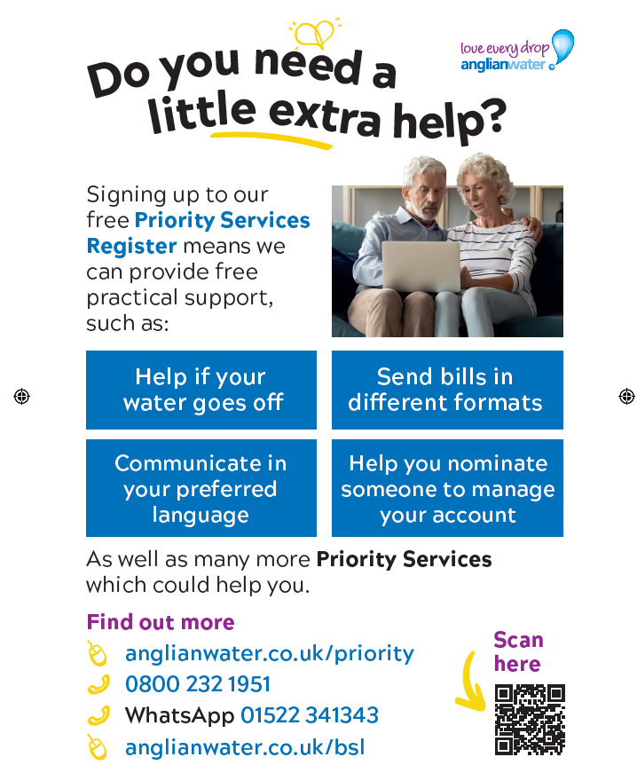 Anglian Water’s Priority Services Register (PSR) is a free service that offers extra help to customers who may need additional support. It’s designed for people with long-term illnesses, disabilities, or mobility, sight, hearing, or speech difficulties. It can also support customers going through temporary life changes, such as job loss, bereavement, divorce, recovery from treatment, or families with a baby under 12 months old.